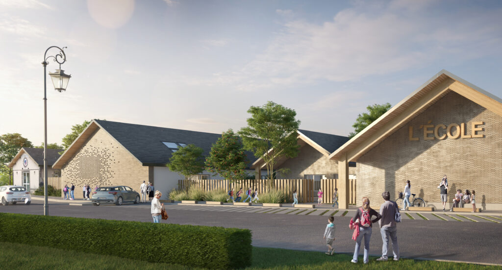 Construction du groupe scolaire de 5 classes, d’une salle d’évolution, d’un restaurant scolaire et d’aménagements extérieurs. Réhabilitation complète d’un bâtiment existant pour le transformer en garderie péri scolaire.