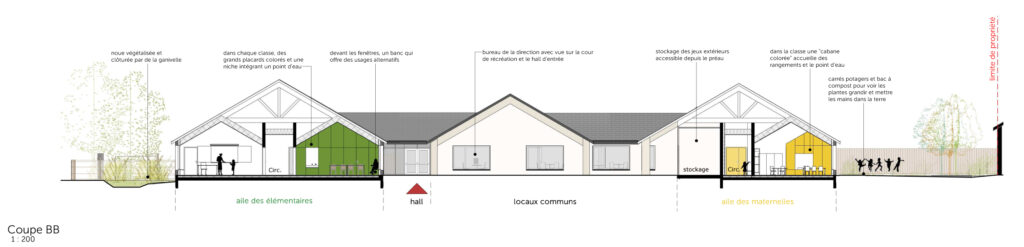 Il a été travaillé sous forme de 2 longères jointent par un élément central ou prennent place le hall d’entrée et la bibliothèque. Les longères sont travaillées en brique sur les pignons et offrent sur ces façades de grands éléments vitrés. Ces éléments vitrés ont une faible allège pour servir de « banc » aux élèves côté cour de récréation et côté classe.