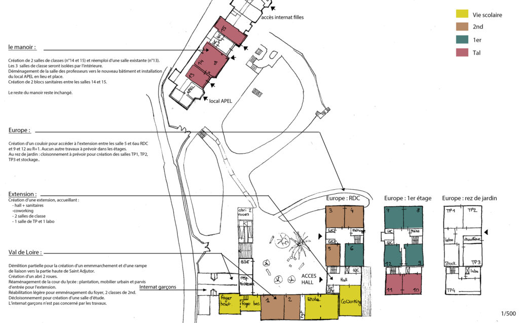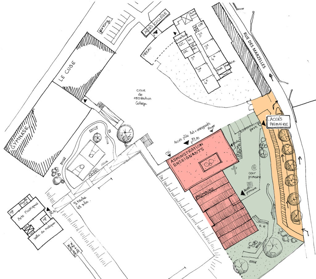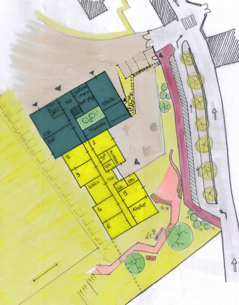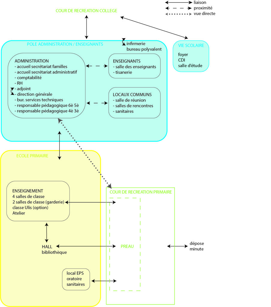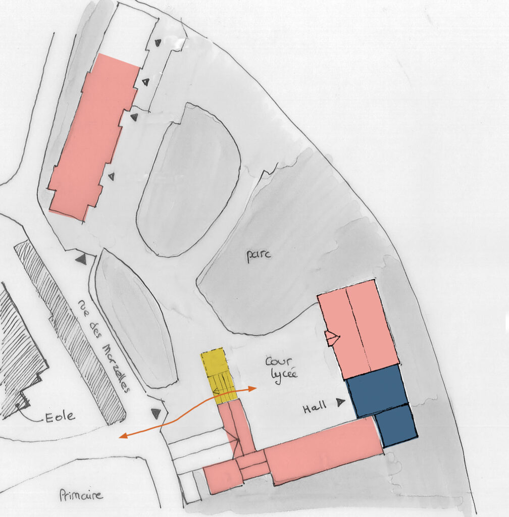 Au delà des analyses règlementaires (PLU, sécurité incendie, PMR …) nous avons accordé une grande importance à l’échange avec note maître d’ouvrage, le directeur, les différentes directions, les enseignants et les usagers (= les élèves), afin d’établir un programme fidèle aux attentes exprimées ou non, aux contraintes du site et à l’évolution de la pédagogie. Nous avons également apporté de part notre expérience (ainsi que celle de nos co-traitants), un regard complémentaire sur des sujets non soulevés lors des 1er rdv.