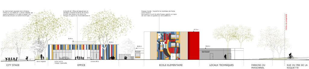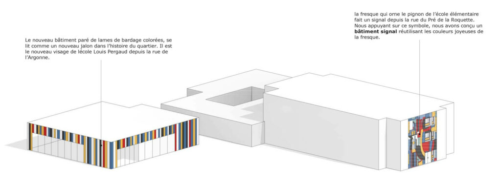 Notre projet propose d’accompagner cette métamorphose tout en tenant compte de l’histoire du quartier. La fresque qui orne le pignon de l’école élémentaire existante était un signal depuis la rue du Pré de la Roquette. Elle révélait le statut d’équipement public de ce bâtiment plutôt discret. Nous appuyant sur ce symbole, nous avons conçu un bâtiment signal réutilisant les couleurs de la fresque.