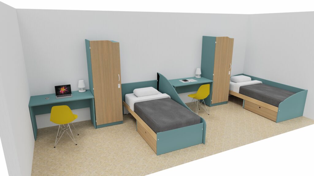 Chaque chambre dispose d’un bureau, d’un panneau d’affichage, d’une lampe, d’une chaise DSR Eames et d’une armoire.