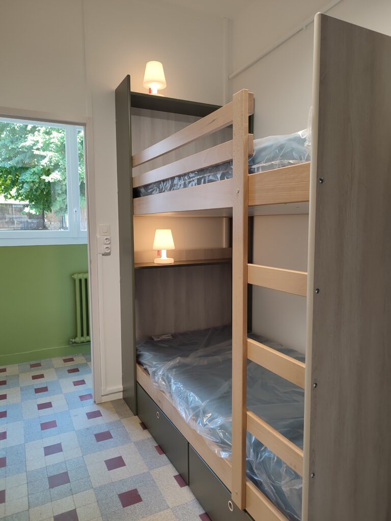 Les chambres et les partis communes ont été entièrement rénovées. Les chambres sont travaillées sur 2 teintes et agrémentée de lampes nomades Fatboy qui font le bonheur des élèves.